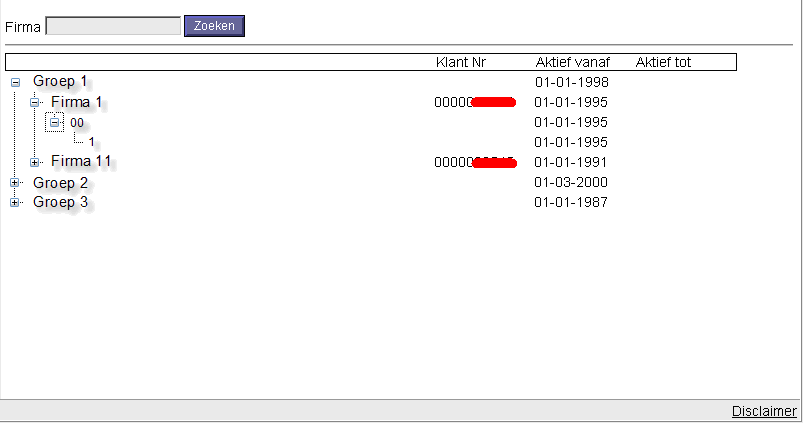 Op het scherm worden de firma’s gegroepeerd per groep. Door de groep open te klikken via + teken, worden de onderliggende firma’s zichtbaar. De departementen onder de firma en de categorieën onder de departementen worden via dezelfde manier zichtbaar.